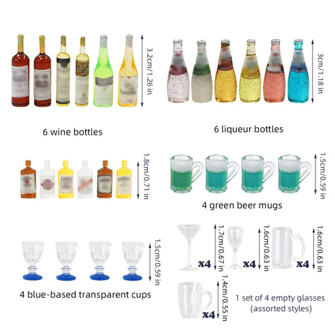 Premium Realistic Design & Safe Material: Crafted from high-quality resin plastic, our miniature bottles and glasses are lightweight and safe for decorative use. Each piece boasts a realistic design with vibrant colors and fine details, ensuring they look authentic as standalone displays or as part of your miniature world.